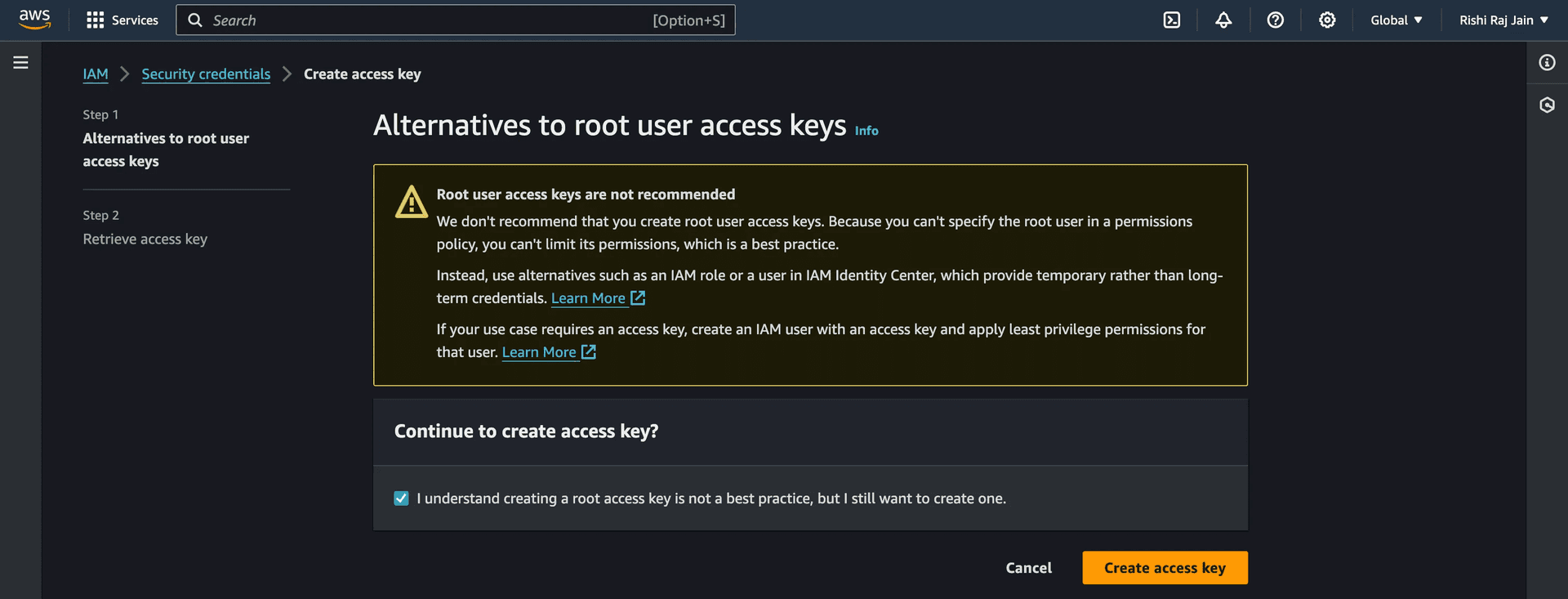 In the navigation bar on the upper right in your AWS account, click on your name, and then choose Security credentials.